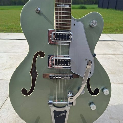 G5566 JET dobbelt hals guitar, årgang 2009, i meget god stand, med to mini-humbuckere, 3-vejs kontakt, Bigsby B50 tremolo, ahorn hals, rosewood gribebræt, sølv sparkle finish, skalaer 628 mm og 755 mm, vægt 7 kg, ingen tilbehør, oprindelse privat samling. Klik på den blå "gå til varen" knap, for at købe eller byde på denne vare. Den samlede pris vil blive vist inden du afgiver dit bud.