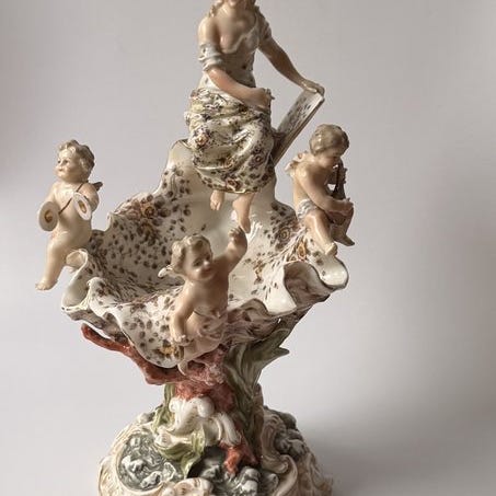 Tysk porcelæn salscene, ca. 1890–1910, der forestiller en gruppe musikere med levende polykromi og gulddetaljer, håndmalet, mål 28 × 35 × 18 cm, vægt 3 kg, i fremragende stand med minimale slid og en mindre guitar-skade. Klik på den blå "gå til varen" knap, for at købe eller byde på denne vare. Den samlede pris vil blive vist inden du afgiver dit bud.