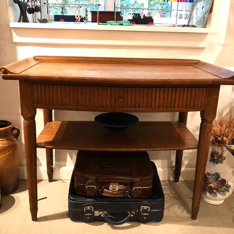 Et tidligere væveapparat til tæppevævning omdannet til et elegant klapbord, der også kan bruges som entrékonsol eller som bar-møbel.