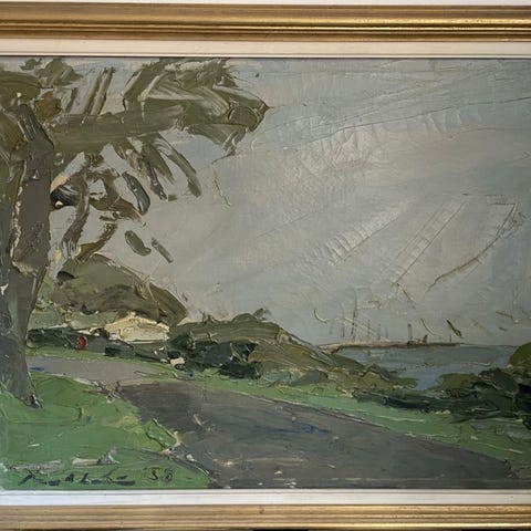 Den naive, expressionistiske stil fanger en surrealistisk drømmetilstand – barnlig, uhyggelig, legende –, typisk for Hökenströms blandeteknik med akryl og applikationer på lærred.