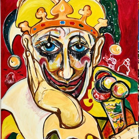 Maleriet „Pinocchio Dreams“ af Sven-Arne Hökenström viser en drømmende, forvrænget scene med en Pinocchio-lignende figur i midten: Klovnen med lang næse, gul hue og rød hat kigger opad, omkranset af blå skyer og gule stjerner mod en mørk, natlig baggrund.