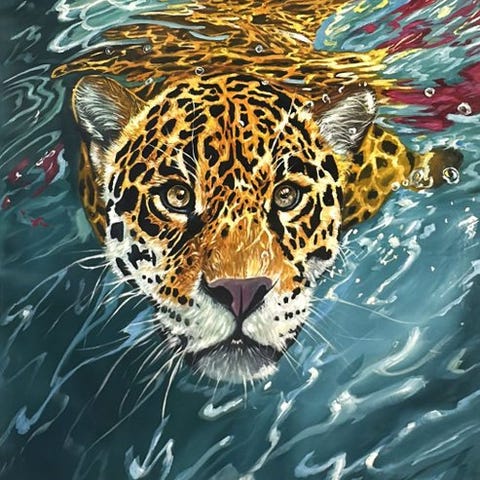 I dette oliemaleri på lærred fanger Cristian Mesa Velázquez det helt nøjagtige øjeblik, hvor kroppen giver slip på det flydende tomrum. Den omvendte komposition, den anatomiske kraft og vandets vibration skaber en intens og filmisk scene.