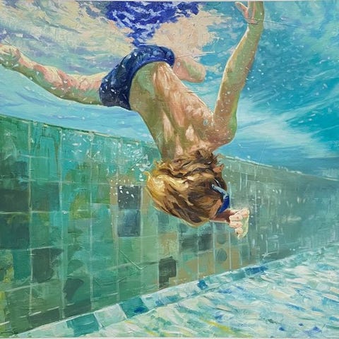 Kontrasten mellem den dybt blå farve indeni og de varme toner i horisonten skaber en delikat spænding mellem det, der foregår udenfor, og hvad man føler indeni. Bordet, fast og geometrisk, støtter denne balance og forankrer følelsen i hverdagen.