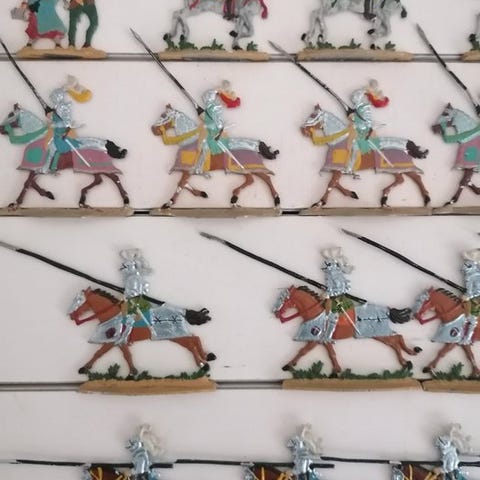 Sæt af soldaterfigurer fra Napoleonsperioden med antikt vitrineskab inkluderet.