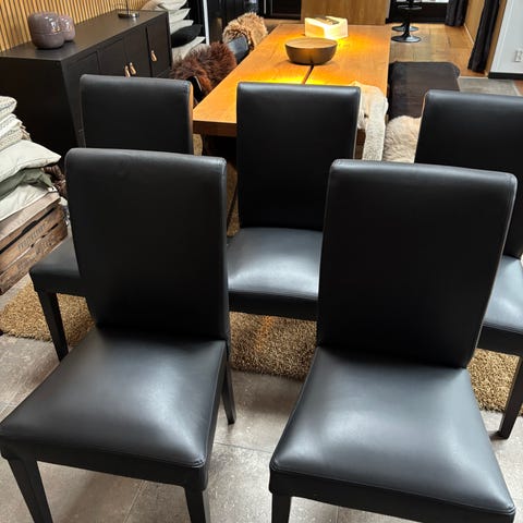 6 stk pæne mørkebrune læderstole (ikke ægte læder) sælges, ikke så gl, sælges pga. ombygning. Mål: Siddehøjde 46,5 cm (standard), Bredde 46,5 cm, højde fra gulv til øverst ryg 80 cm, chrom ben, nemme at holde, gav 6x899 kroner for nye og er ca. 1,5 år gl, prisen er KUN 1500 kroner for alle 6, da de skal væk, gør en god handel. Realistisk bud modtages!