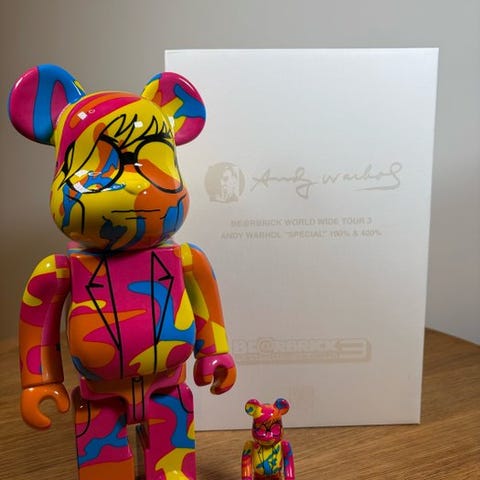 BEARBRICK af Andy Warhol & Jean-Michel Basquiat, begrænset udgave, digital maleri fra Japan, 28 cm høj og 7 cm bred, ikke signeret og i fremragende stand. Klik på den blå "gå til varen" knap, for at købe eller byde på denne vare. Den samlede pris vil blive vist inden du afgiver dit bud.