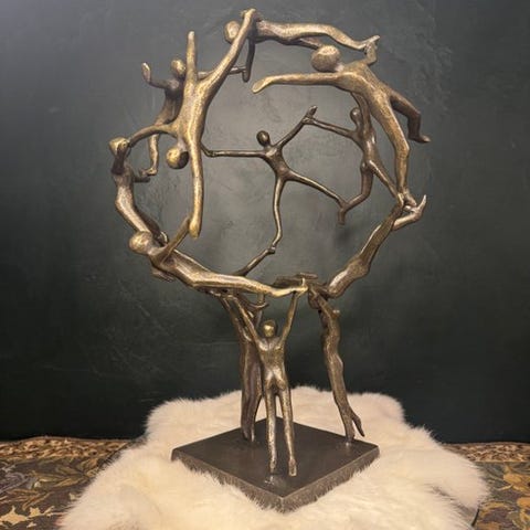 Denne smukke og meningsfulde bronzeskulptur viser seks menneskelige figurer, der sammen når en imponerende højde. Værket skildrer på en kraftfuld måde samarbejde, tillid og fælles ambition og udgør dermed et stærkt symbolsk kunstobjekt.