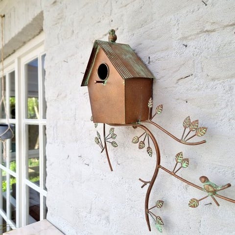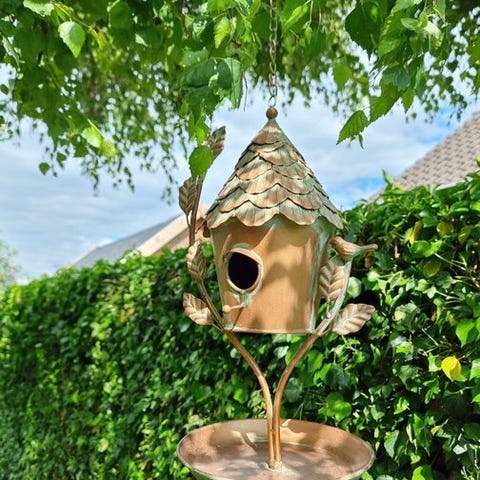 Meget smukt dekorativt haveornament - fuglehus pyntet med grene og småfugle. Dimensionerne på dette stykke er som følger (+/-):