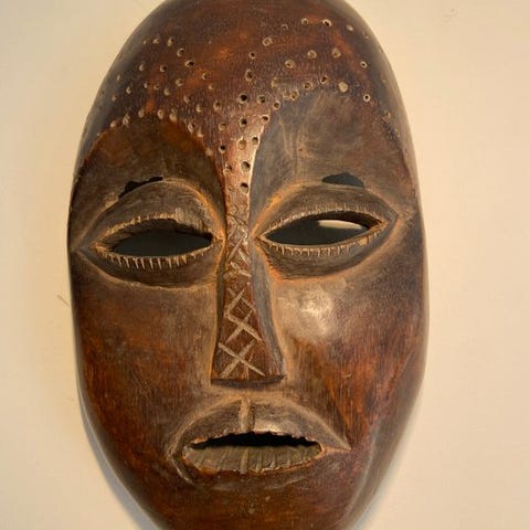 Lukwakongo-maske fra Lega-kulturen, oprindelig fra Den Demokratiske Republikken Congo, lavet af træ og fiber, 32 cm høj, fra slutningen af det 20. århundrede, i god stand, fra privat samling. Klik på den blå "gå til varen" knap, for at købe eller byde på denne vare. Den samlede pris vil blive vist inden du afgiver dit bud.