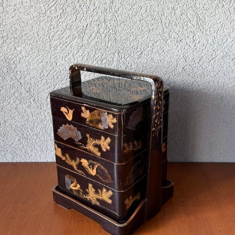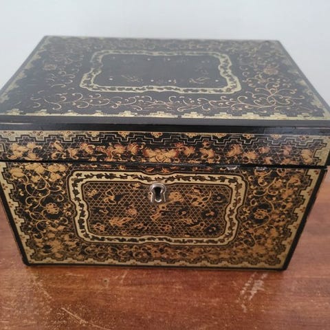 Raffineret kinesisk æske i sort lakeret træ, dekoreret med rige chinoiserie-scener, fint udførte i forgyldning. Lokkedet præsenterer et stemningsfuldt østligt landskab med pagoder, små broer, figurer og naturmotiver, udført med stor omhu for detaljer og let reliefbearbejdning.
