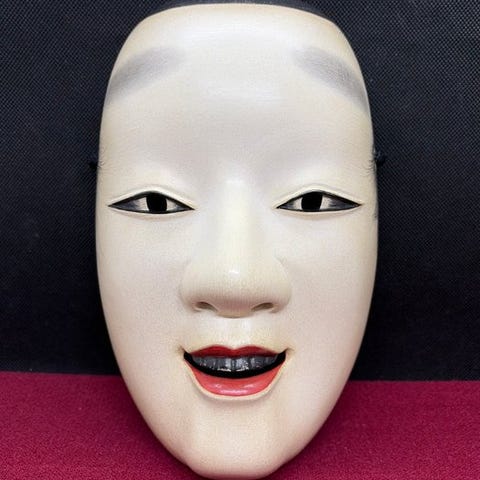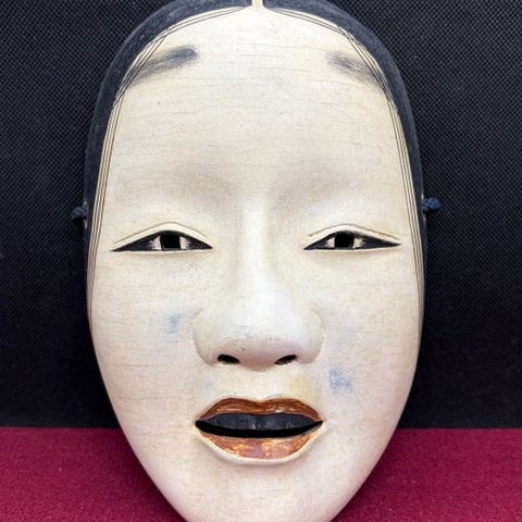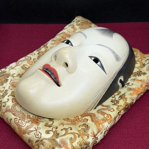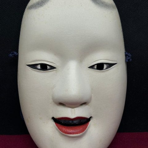 Smuk, høj kvalitet japansk traditionel håndskåret kvindelig træ-Nohmaske - Tenjin天神, fint udskåret med omhyggelige detaljer, fremstillet i 1996 af Michiyama道山 som underskrev på bagsiden.