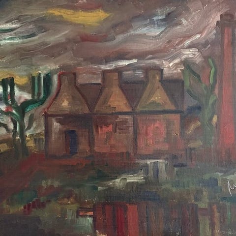Malet i en modernistisk stil med tydelige konturer og forenklede former.