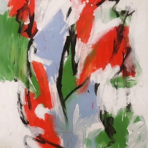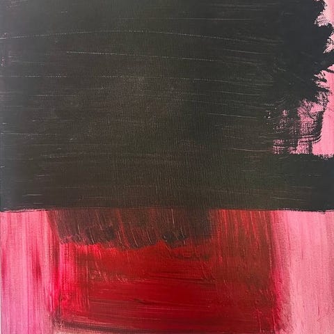 Kompositionen er bygget op omkring dristige gestuelle penselstrøg i dyb sort, i kontrast til udtryksfulde røde sprøjt og flydende organiske former. Den dynamiske vertikale struktur skaber bevægelse og følelsesmæssig intensitet, mens det negative rum forstærker den dramatiske kontrast mellem lys og mørke.