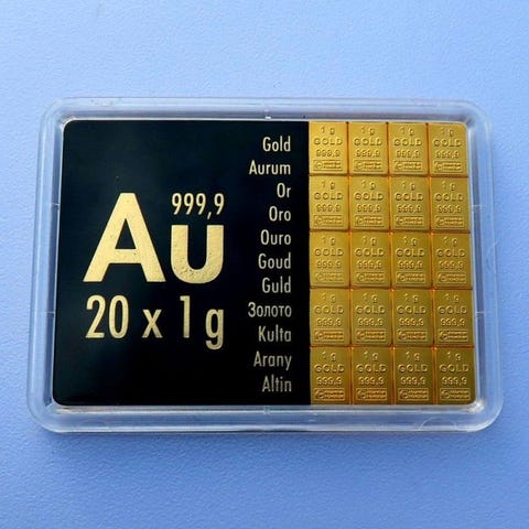 Med Combibar guldpladen 20 x 1 g køber du en guldbar i det praktiske format A8. Valcambi er indehaver af den eksklusive produktionslicens for CombiBars, som i Tyskland normalt er kendt som guldplader. Selvfølgelig overholder Combibar-guldpladerne LBMA's Good Delivery-standarden. Combi-guldbarerne fra Valcambi udgør en særlig investering i guld, da guldpladen består af 20 x 1 g guldbarer i finhed 999,9 – 24 karat. De enkelte guldbarer, som du kan købe og sælge med Combibar, kan nemt adskilles ved at knække dem fra hinanden, da de enkelte små guldbarer i pladen er forbundet via brudpunkter. Brudpunkterne mellem de enkelte mini-guldbarer på Combibar-guldpladerne er nøje beregnet, så