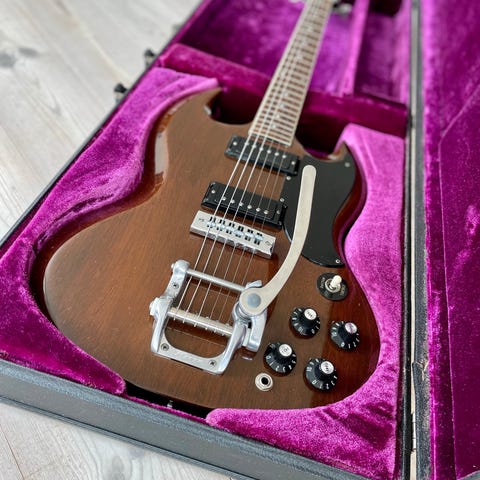 Gibson SG Special elektrisk guitar, årgang 1969, fremstillet i USA, i god stand og testet funktionsdygtig, med hårkasse; mahognistikko og hals, malet i purpurrød i 1980’erne, skala 628,65 mm, 22 bånd, refrettet, originale stemmeskruer udskiftet med Schaller, P90 pickups, vægt ca. 3 kg, ingen reparationer og klar til at spille. Klik på den blå "gå til varen" knap, for at købe eller byde på denne vare. Den samlede pris vil blive vist inden du afgiver dit bud.