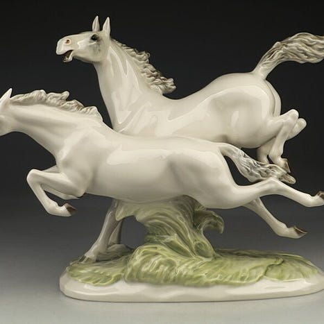 Smuk stiliseret porcelænsfigur af en hyrdehund fra Hutschenreuter, ca. 1930, med bundmærke og nummereret, i god stand; målene 26 cm bred, 31,5 cm høj og 16 cm dyb, vægt 1787 g. Klik på den blå "gå til varen" knap, for at købe eller byde på denne vare. Den samlede pris vil blive vist inden du afgiver dit bud.