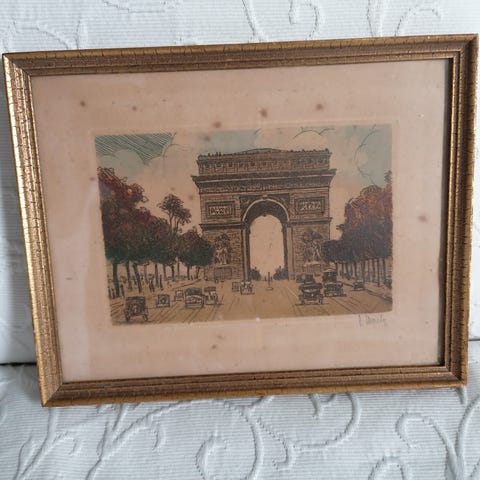 Lille tryk med motiv af Triumfbuen i ramme af mahogni med intarsia. Bredde: 26 cm. Højde: 21,8 cm. Med teksten: Arc de triomphe de l'Étoile - Côté de Neuilly. Fremstår gulnet og med brune pletter.