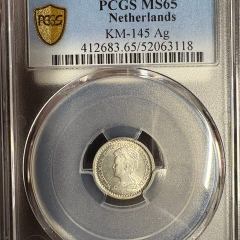 Et enkelt 1898 hollandsk sølvverdensmønter med dronning Wilhelmina, MS62 certificeret af PCGS (certificeringsnummer 531770.62/60852834). Klik på den blå "gå til varen" knap, for at købe eller byde på denne vare. Den samlede pris vil blive vist inden du afgiver dit bud.
