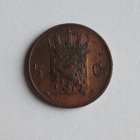 Et kobber halvcents fra 1846 med Willem II, Nederlandene, delvist i original møntfarve og ikke certificeret. Klik på den blå "gå til varen" knap, for at købe eller byde på denne vare. Den samlede pris vil blive vist inden du afgiver dit bud.