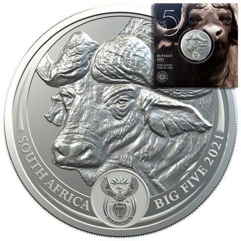 Den femte og sidste udgivelse i den populære Big Five-serie fra South African Mint er dedikeret til bøflen. Sydafrika er fortjent stolt af sit ekstraordinære dyreliv. Dyrene kendt som „Big Five“ - Elefant - Løver - Bøfle - Næsehorn - Gepard - er landmærker og ambassadører for dette kulturelt rige land. Motivets sølvmønt viser den imponerende portræt af en bøfler. Inkluderet i designet er også