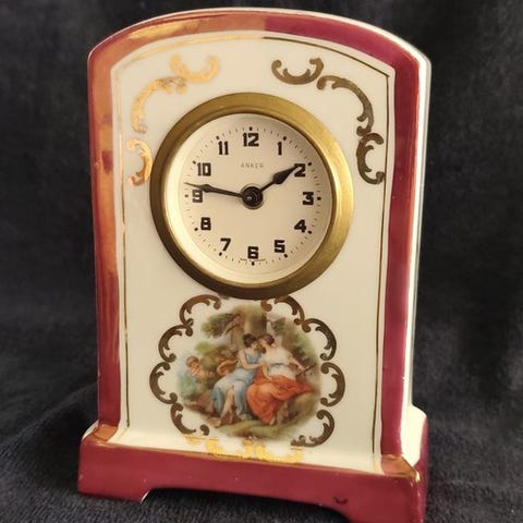 Messing bordururur ur med mahogni-træ og velours, mekanisk værk, 8-dages reserve, slag for halvfems time med en klokke, fremstillet i Mulhheim an der Donau, Tyskland af Uhrenfabrik Mulhheim DRGM, ca. 1930–1940, i god brugt stand med mindre alders- tegn, højde 44 cm, bredde 24 cm, dybde 16 cm, vægt 5 kg. Klik på den blå "gå til varen" knap, for at købe eller byde på denne vare. Den samlede pris vil blive vist inden du afgiver dit bud.