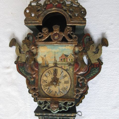Friese staartklok fra ca. 1960–1970, af. træ med mahogni-lignende finish, mekanisk urværk med længerevarende strømreserve, 90 cm høj, 24 cm bred, 15 cm dyb, vægt 10 kg, oprindelse Nederlandene, i god brugt stand, med månefase og to engle samt Atlas på toppen, vægtstykker skal spændes hver anden uge. Klik på den blå "gå til varen" knap, for at købe eller byde på denne vare. Den samlede pris vil blive vist inden du afgiver dit bud.