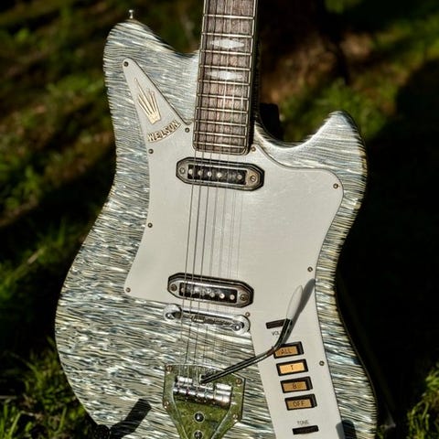Fantastisk guitar med « surf », japansk inspiration fra Mosrite. Fuldt restaureret af en berømt lutemager i Paris, Frank Henry, og af Hepcat’s elektroniske mestere i Frankrig. Vibratoet er optimeret med en bro, strengholder og ruller til stemmeskruer, suppleret af låsemekanismer. Det hele gør vibratoet fremragende! Pickups-omviklingen er udført med wire « enamed AWG43 » for et højere udgangsniveau, og de keramiske magneter er udskiftet til Alnico 2 polepieces. Det elektroniske arbejde er udført af HEPCAT i Frankrig. Guitaren spiller vidunderligt: vintage, dybde og vintage varme i rigelige mængder. Lige hals med truss rod til rådighed ved slutningen af gribebrættet. Frets i sublimt Rio-palissander med perlemorindlæg. Lav action, meget nem at
