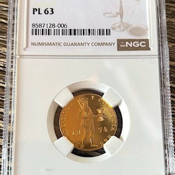 1818 guld dukaten præget i Utrecht, Nederlandene, vægt 3,5 g guld 983/1000, diameter 21 mm, kabelrand, minimalt slid og sandsynligvis ubrugt. Klik på den blå "gå til varen" knap, for at købe eller byde på denne vare. Den samlede pris vil blive vist inden du afgiver dit bud.