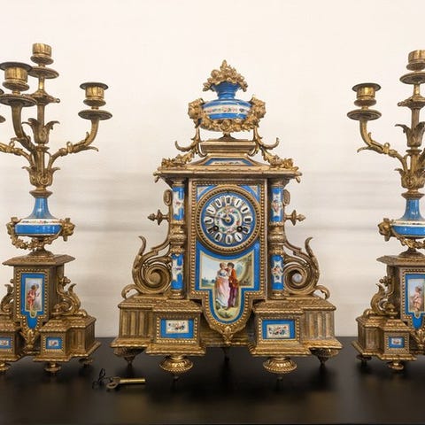Centret domineres af en rund emaljeret urskive med romertal, omgivet af en perlebesat ramme i forgyldt bronze. Man kan tydeligt se signaturen «Déstigny à Paris» på urskiven — et
