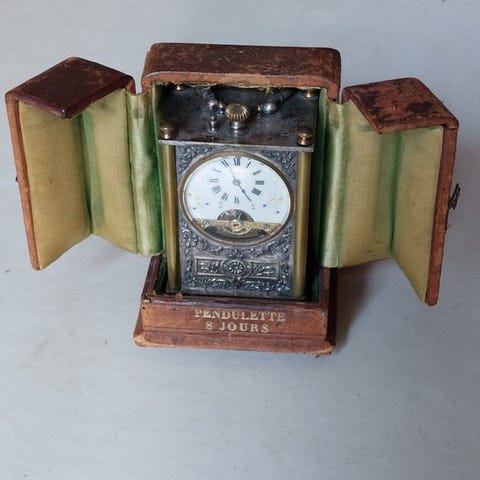 Hele enheden står på en smukt forarbejdet bronze fod, og topen af vasen dannes af et bronze ornament. Bagsiden af uret er beskyttet af en låge. Uret er i fremragende løbende stand. Uret leveres med nøgle.
