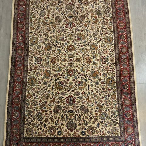 Oprindelse: Indien; håndvundet persisk Keshan-tæppe i uld på bomuld, 290 × 194 cm, produceret i slutningen af det 20. århundrede. Klik på den blå "gå til varen" knap, for at købe eller byde på denne vare. Den samlede pris vil blive vist inden du afgiver dit bud.