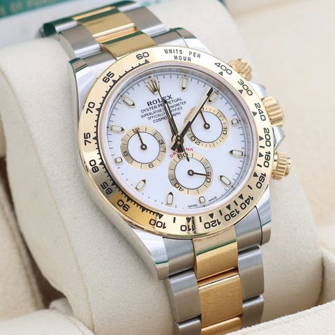 Skiven på denne Daytona er hvid/elfenbenfarvet med gyldne kransede subdials.