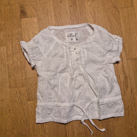 H&M bluse til pige i str. 110. Langærmet model i grøn bomuld med små hvide hjerter som mønster. Blusen har rund hals og er velegnet til hverdagsbrug. Materialet er bomuld, som giver en blød og behagelig pasform for barnet.