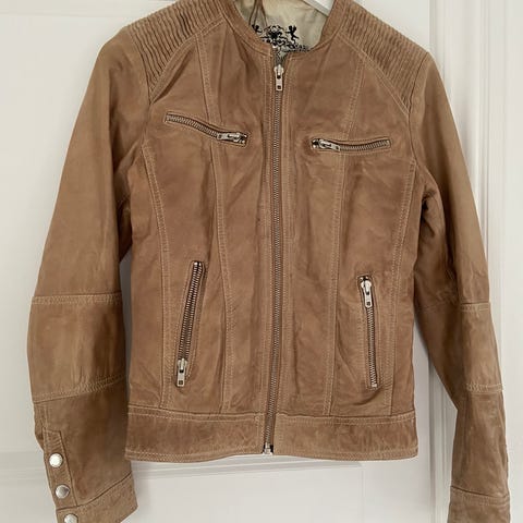 Læderfrakke, str. 56, ingen mærke, mellem brun, almindelig leder, God men brugt, Herre læderjekke i mellem brun med 3 bælanke messing knapper , halvlang.