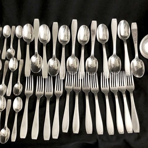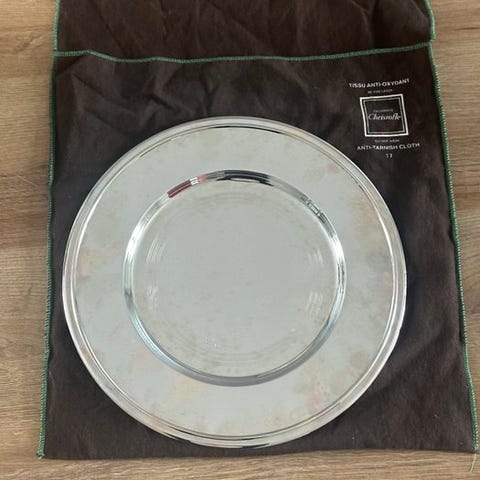 Ménagère i alfénide sølvmetal, model Pompadour, produktion Christofle. Den er i god stand. De 12 gafler måler 20,5 cm. De 12 skeer måler 20,5 cm. De 12 små teskeer måler 14 cm. Og slev måler 32,5 cm.