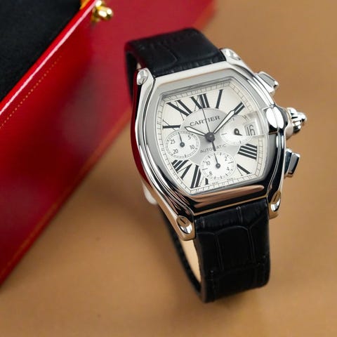 Cartier Roadster Chronograph XL W62019X6/2618 herreur. Det mekaniske urværk løber med en nøjagtighed på få sekunder pr. 24 timer (dette er en gennemsnitlig måling og et øjebliksbillede). Uret leveres i Cartier-kasse med servicecertifikat (11-2025).