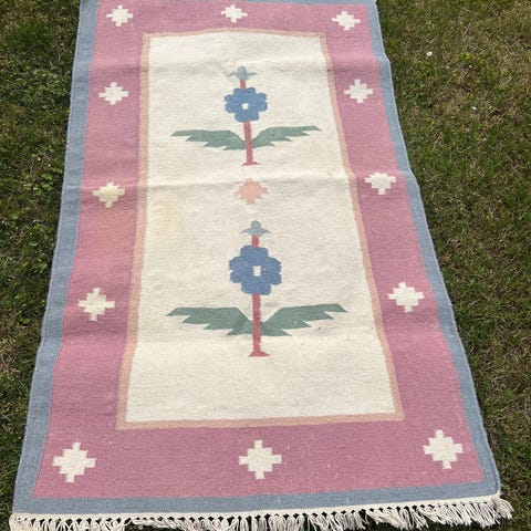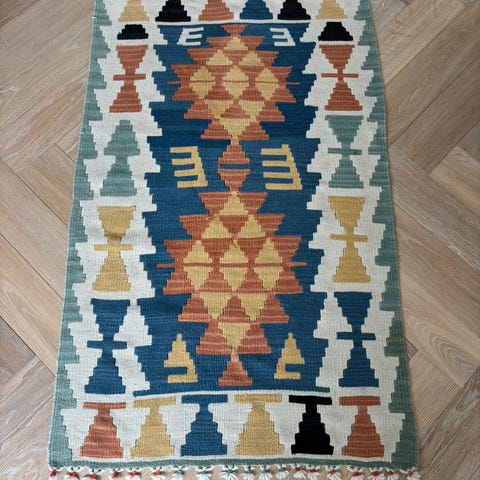 Kraftigt råhvidt kelimtæppe, Løber. Virkelig flot og lækker - fotograferet på begge sider. De sidste billeder har det en plet på den ene side ikke på den anden. Ligger godt fast på gulvet.