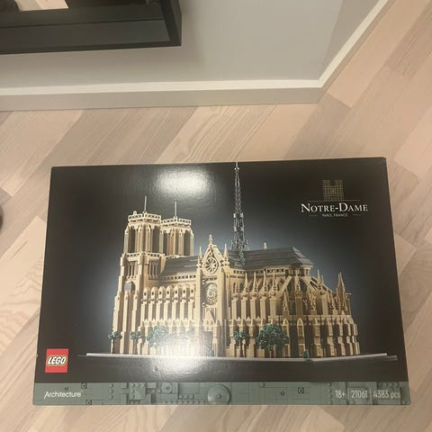 LEGO Notre Dame byggesæt i lys beige og grå nuancer. Modellen forestiller katedralen med detaljerede tårne, spir, støttepiller og facadeelementer. Sættet egner sig som udstillingsmodel og kan bruges som samlesæt for større børn, unge og voksne med interesse for arkitektur og LEGO modeller.
