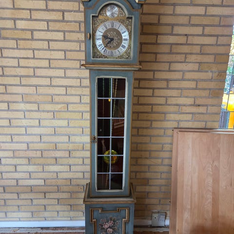 Standur i træ med glaslåge og messingfarvet urskive. Uret har pendul og vægte synlige bag glasfronten. Uret går upåklageligt. Venstre vægt er til uret og højre er til slag. Det slår hel og halv. Klassisk, rektangulær trækasse med profileret top og enkel sokkel.