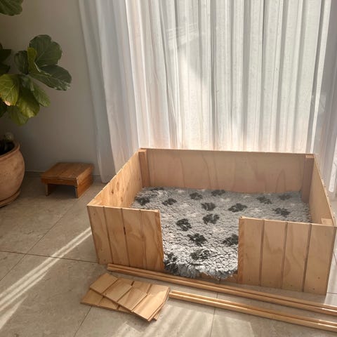 Hvalpekasse brugt 1 gang, brugt til større hund, Berner/retriever blanding. Vandfast bund, rundstokke medfølger så hvalpene ikke kommer i klemme.