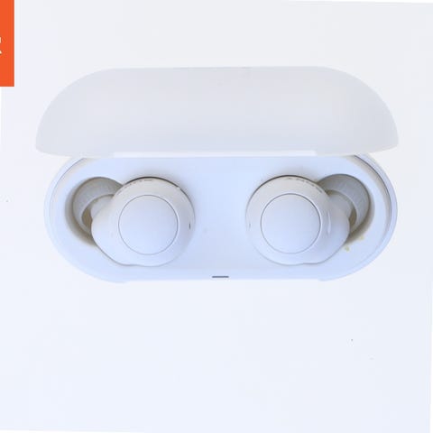 Et sæt hvide JBL trådløse øretelefoner med opladningsetui. Inkluderer forskellige størrelser af silikone ørespidser for tilpasning til brugeren.