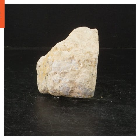 Dette er en geode med en rå ydre overflade i beige og en indvendig hulrum udfyldt med hvidlige kvartskrystaller. Den åbne side af geoden afslører de krystallinske strukturer, som tyder på, at den indeholder kvarts.