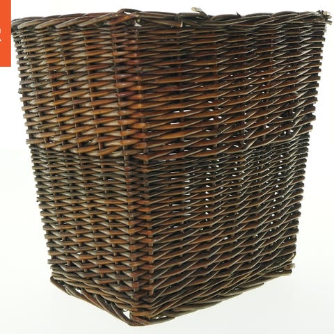 Fletkurv lavet af flettede strimler af et naturmateriale såsom strå eller bambus. Kurven har en stiv, lodret håndtag og en rund form.