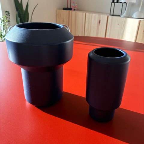 Dette er et sæt af to runde lyseblå vaser med en riflet struktur. De har en glat overflade og en åben top, passende til små blomsterdekorationer. Vasernes design er præget af en moderne stil og er en del af Lucie Kaas' kollektion.