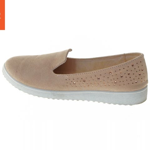 Et par beige sko i størrelse 39, dekoreret med små sten på siderne. Skoene har en hvid sål og er fra mærket Identity. Sålen har et mønster, der sikrer godt greb. Designet er fladt og afslappet, velegnet til afslappet brug.