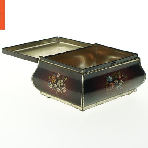 Et rundt, vintage skrin i træ og metal. Skrinet har en detaljeret, mønstret metaldekoration på siderne og en indgraveret dekoration på metalrammen på låget. Lågets centrum består af et rundt broderet stofindlæg med et blomstermotiv. Bunden og indersiden af skrinet er beklædt med brunt træ. Skrinet har synlige brugsspor såsom ridser og mindre misfarvninger, men er generelt i god stand.