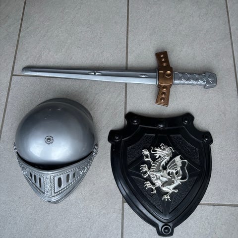 En ridderhjelm lavet af plast, designet med detaljerede ornamenter på visiret. Den har en grå finish og en glat overflade på toppen. Størrelsen på hjelmen er 21 cm, passende til en legetøjsudsmykning eller rollespil. Det indvendige er simpelt uden polstring.