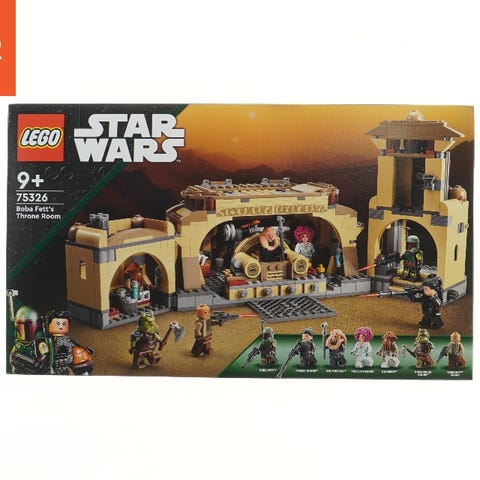 LEGO Star Wars sæt, model 75326, der viser Boba Fett's Throne Room. Sættet inkluderer forskellige figurer fra Star Wars universet samt bygninger og tilbehør til at skabe tronsalen. Målene er 48x28 cm og sættet er egnet til aldersgruppen 9+.