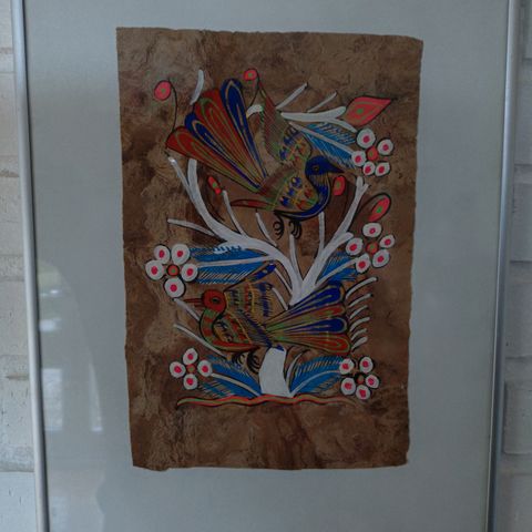Indisk lædermaleri, motiv: Badende elefanter, b: 67 h: 56, Spændende indisk billedkunst. Motivet er tre badende elefanter i en skov. Masser af fine detaljer. Fremstillet af utrolig tyndt læder, der er bemalet. Og udskæringerne er ubegribeligt små og fine . Nærmest rent filigran. Monteret i professionelt passe partout og indrammet i sort træramme med glas af rammemager i Aarhus. Står på Mols men kan gratis leveres i Aarhus og Ebeltoft eller sendes billigt med GLS på købers regning