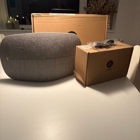 Virkelig flot og velspillende højtaler med Kvadrat stof i lys grå.